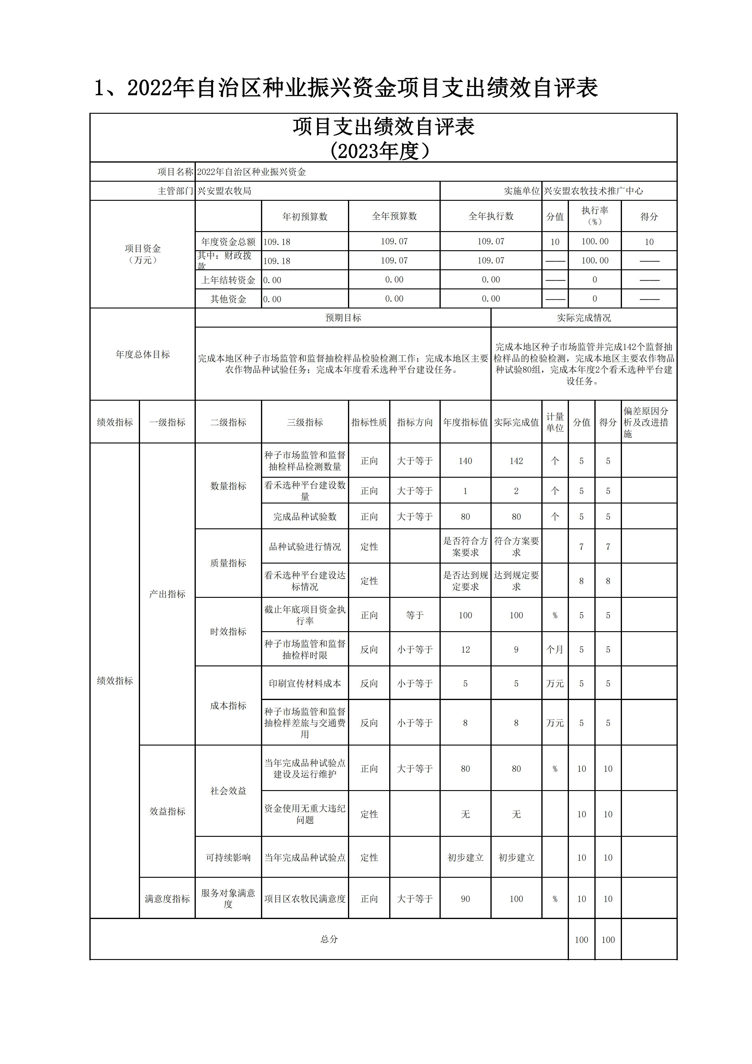 1、2022年自治区种业振兴资金项目自评综述:根据年初设定的绩效目标,项目自评得分100.00分。全年预算数为109.18万元,执行数为109.07万元,完成预算的100.00%。项目绩效目标完成情况:本项目结余共计109.00万元,其中5.00万元用于印刷宣传材料、针对试验管理以及样品抽查的差旅费7.00万元、购买试验相关的专用材料17.70万元、相关培训费4.90万元、购买试验专用设备35.00万元等费用支出。2023年利用2022年剩余、结转资金,实际完成本地区种子市场监管并完成142个监督抽检样品的检验检测(包括监督抽样差旅费用),新建完成3个品种试验点,并完成本地区主要农作物品种试验80组,完成本年度2个看禾选种平台建设任务,很好地按照方案执行并达到规定要求。资金使用无重大违纪问题。利用2022年种业振兴资金,很好地完成2022和2023年计划任务。发现的主要问题及原因:无。下一步改进措施:无。