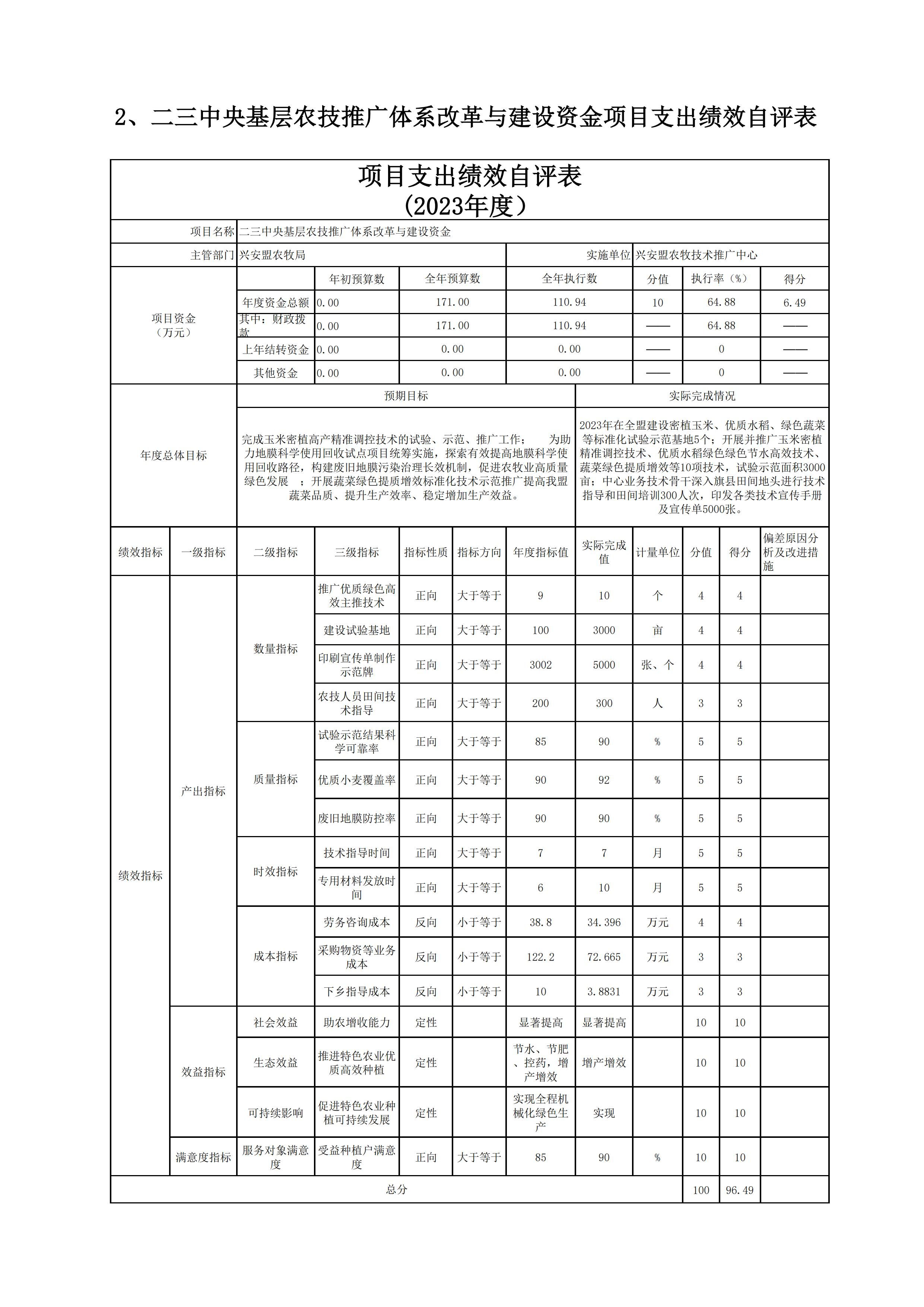 2、二三中央基层农技推广体系改革与建设资金项目自评综述:根据年初设定的绩效目标,项目自评得分100.00分。全年预算数为171.00万元,执行数为171.00万元,完成预算的100.00%。项目绩效目标完成情况:年初绩效目标设定全部完成,2023年在全盟建设密植玉米、优质水稻、绿色蔬菜等标准化试验示范基地5个;开展并推广玉米精准调控技术、优质水稻绿色节水高效技术、蔬菜绿色提质增效等10项技术,试验示范面积3000亩,中心业务骨干深入旗县田间地头进行技术指导和田间培训300人次,印发各类技术宣传手册及宣传单5000张。发现的主要问题及原因:项目资金绩效管理是一个较新理念,相关知识掌握不足,本领域相关内容形成的三级指标不够严谨完善。下一步改进措施:继续抓好基层农技推广体系改革与建设补助项目实施,充分发挥农牧推广科研教学体系协同推广作用,进一步健全工作组织协调机制,明确工作职责,形成工作合力,发挥最大效能,不断完善推广服务模式,提升基层农技推广队伍素质,开展农技推广服务,示范高效主推技术,提升基层体系推广能力。