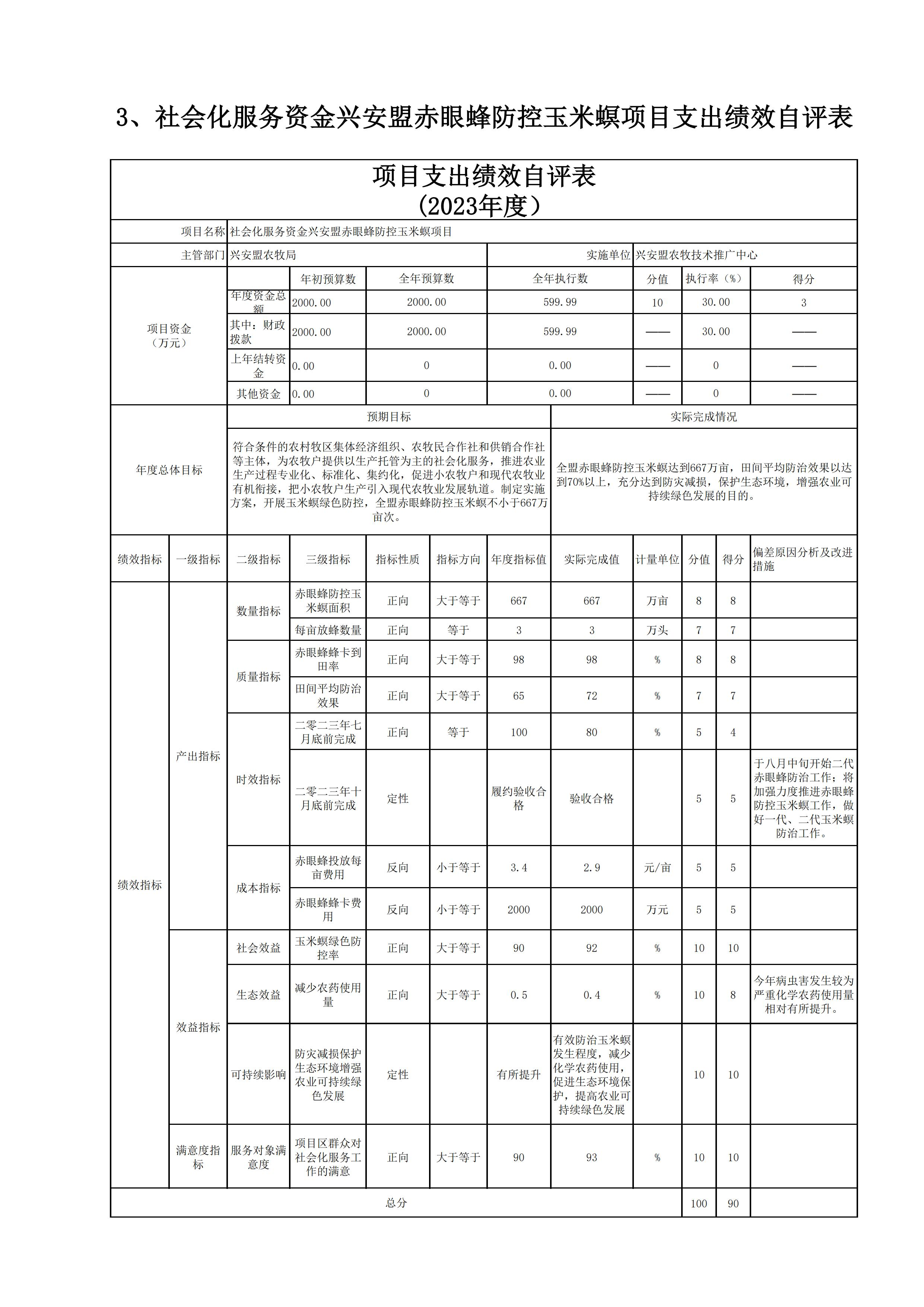 3、社会化服务资金兴安盟赤眼蜂防控玉米螟项目自评综述:根据年初设定的绩效目标,项目自评得分97.00分。全年预算数为2000.00万元,执行数为1999.95万元,完成预算的100.00%。项目绩效目标完成情况:2023年赤眼蜂防控玉米螟面积共达到667万亩,每亩放蜂数量可以达到3万/亩,田间平均防治效果以达到70%以上,充分达到防灾减损,保护生态环境,增强农业可持续绿色发展的目的。聘用病虫害防控专家针对赤眼蜂蜂卡到田率和田间防治效果进行仿效调查。通过大面积示范推广赤眼蜂防控玉米螟绿色防控项目,通过明显的防控效果以及通过培训会和现场下乡指导工作充分向兴安盟地区农户普及绿色防控、统防统治技术,为提高农作物虫害防治率减少化学农药投入降低农业面源污染风险。发现的主要问题及原因:项目资金绩效管理是一个较新理念,相关知识掌握不足,本领域相关内容形成的三级指标不够严谨完善。下一步改进措施:加强赤眼蜂防控玉米螟等相关绿色防控、统防统治相关内容宣传培训力度,提高农户认识度,加大各旗县市赤眼蜂防控玉米螟试验示范面积以效果增强农户对该项目的认可度;进一步完善监控措施和资金管理制度建设,并细化项目资金使用。