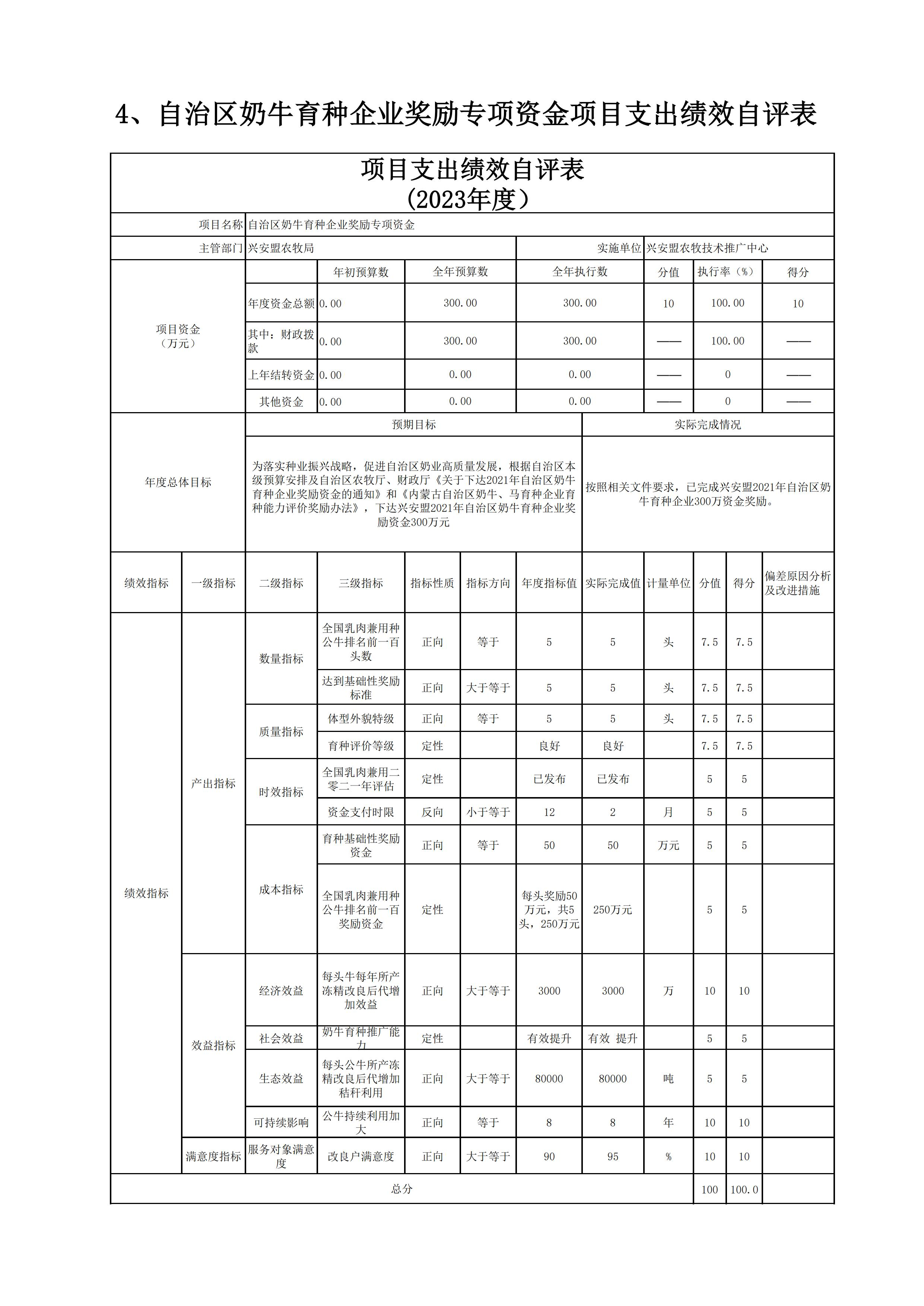 4、自治区奶牛育种企业奖励专项资金项目自评综述:根据年初设定的绩效目标,项目自评得分100.00分。全年预算数为300.00万元,执行数为300万元,完成预算的100%。项目绩效目标完成情况:按照相关文件要求,已完成兴安盟2021年自治区奶牛育种企业300万资金奖励,通过项目实施,种公牛所产冻精改良后代效益增加,奶牛育种推广能力有效提升,种公牛所产冻精改良后代秸秆利用率增加,种公牛持续利用率增加,进一步提升了奶牛种公牛育种水平。发现的主要问题及原因:项目资金绩效管理是一个较新理念,相关知识掌握不足,本领域相关内容形成的三级指标不够严谨完善。下一步改进措施:继续抓好自治区奶牛育种企业奖励资金项目实施,加大内蒙古中农兴安种牛科技有限公司扶持力度,争取培育出更多TPI-中国乳肉兼用牛总性能指数前100名种公牛,使乳肉兼用奶牛种公牛育种推广能力进一步提升,种公牛利用率持续增加,进一步提升奶牛种公牛育种水平;同时,根据项目相关要求,进一步做好项目绩效和监控工作,更好发挥项目经济、社会、生态效益以及可持续影响力。