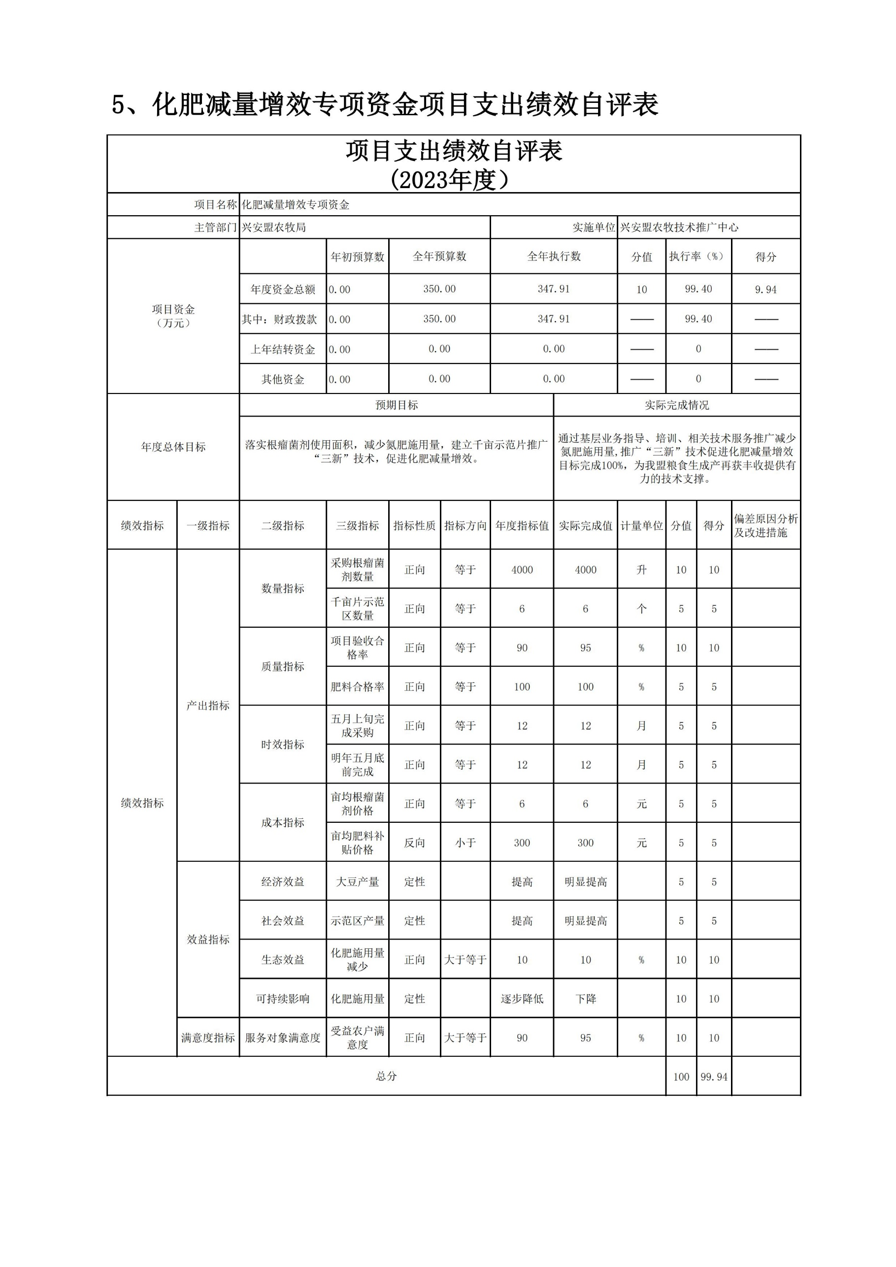 5、化肥减量增效专项资金项目自评综述:根据年初设定的绩效目标,项目自评得分100.00分。全年预算数为350.00万元,执行数为347.91万元,完成预算的99.40%。项目绩效目标完成情况:巩固提升测土配方施肥基础,完成肥料效应、化肥利用率等田间试验65个,农户施肥调查1177户,以县为单位更新完善肥料配方,全盟测土配方施肥技术推广面积1581万亩次以上。因地制宜地推广增施有机肥、生物肥、藻类肥料等多元替代化肥措施,有针对性地推广施用缓控释肥、水溶性肥等新型肥料,加强机艺融合、技物结合、物械配合,打造29万亩“三新”集成配套示范区,其中核心示范区面积占到总示范区面积的10%以上。推广使用大豆根瘤菌剂,减少氮肥用量,全盟接种大豆根瘤菌剂面积40万亩以上,提升全盟大豆产能。发现的主要问题及原因:项目资金绩效管理是一个较新理念,相关知识掌握不足,本领域相关内容形成的三级指标不够严谨完善。下一步改进措施:进一步健全工作组织协调机制,明确工作职责,形成工作合力,发挥最大效能,不断完善推广服务模式,提升基层农技推广队伍素质,开展农技推广服务,示范高效主推技术,提升基层体系推广能力;同时,进一步做好项目相关绩效和监控工作。