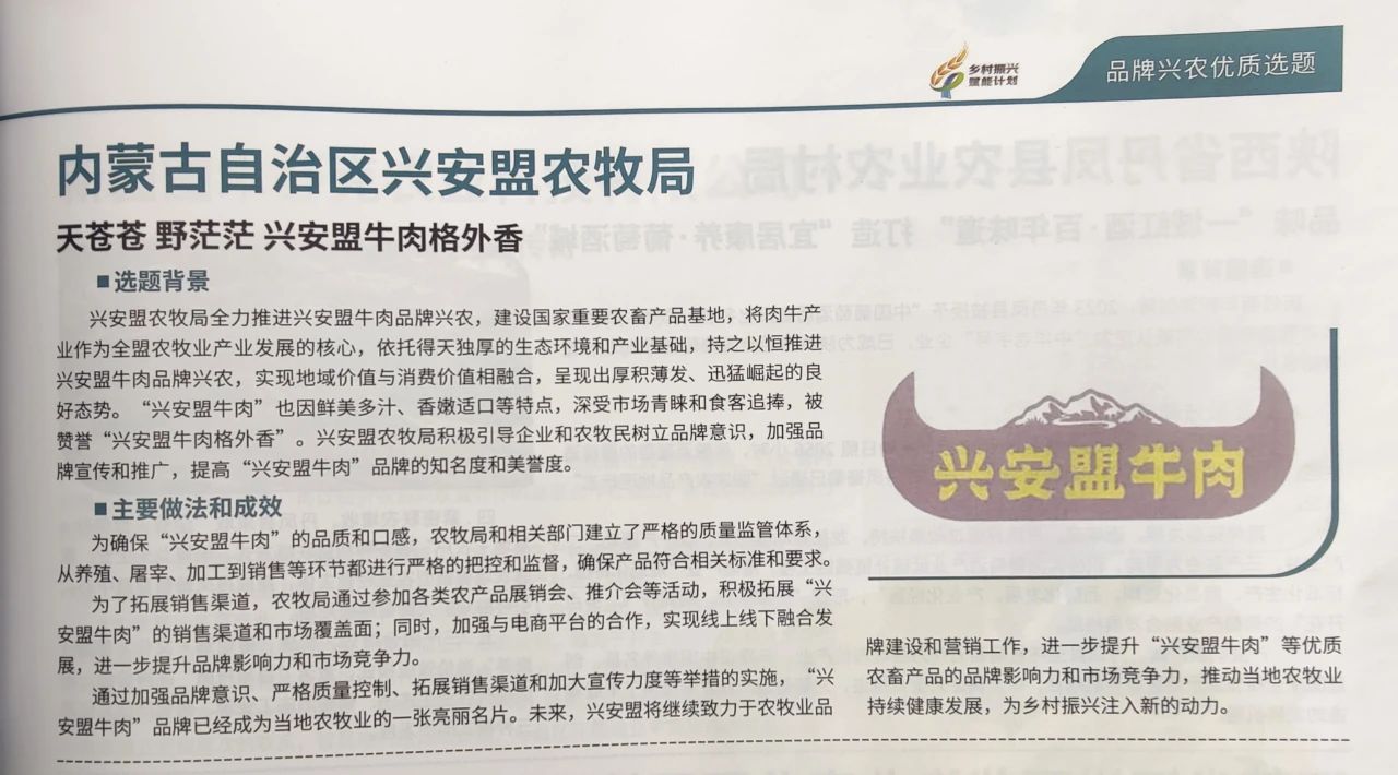 2024年8月,由中国农业电影电视中心联合相关媒体和行业组织主办的乡村振兴赋能计划走进河北蔚县隆重举行,活动期间公布了全国乡村振兴优质选题。其中,兴安盟农牧局申报的兴安盟牛肉入选全国乡村振兴品牌兴农优质选题,全国共10家单位入选,全区仅1家。