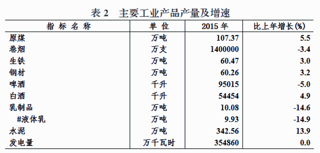 从主要工业产品产量看,全盟原煤产量107.37万吨,比上年增长5.5%;卷烟产量28.00万大箱,下降3.4%;液体乳产量9.93万吨,下降14.9%;钢材产量60.26万吨, 增长3.2%;发电量35.49亿千瓦小时,与上年持平。