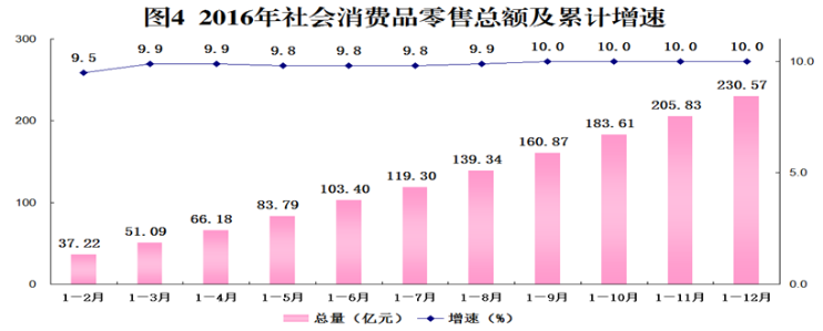 全年社会消费品零售总额230.57亿元,比上年增长10.0%。分城乡看,城镇消费品零售额183.82亿元,增长9.9%;乡村消费品零售额46.75亿元,增长10.1%。分消费形态看,餐饮收入22.26亿元,增长11.4%;商品零售208.31亿元,增长9.8%。