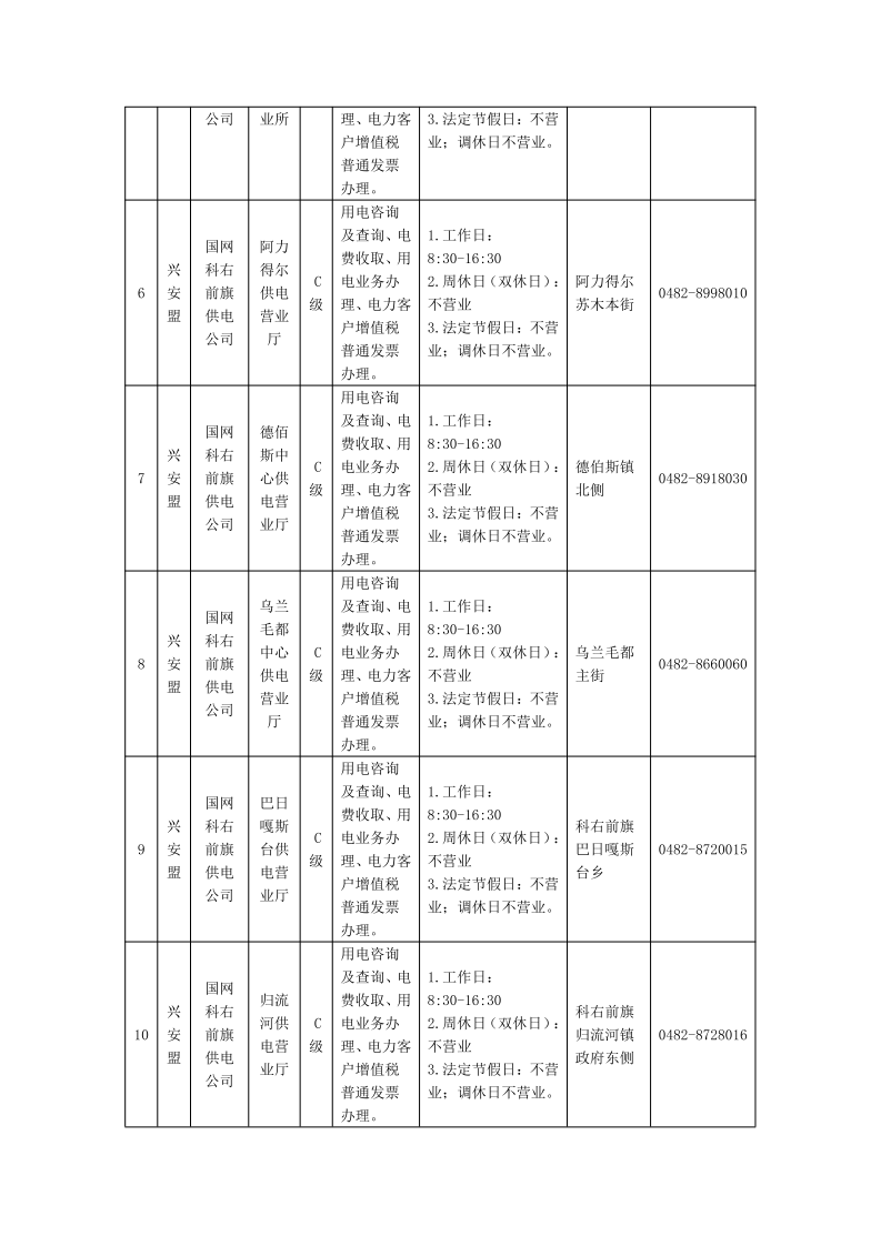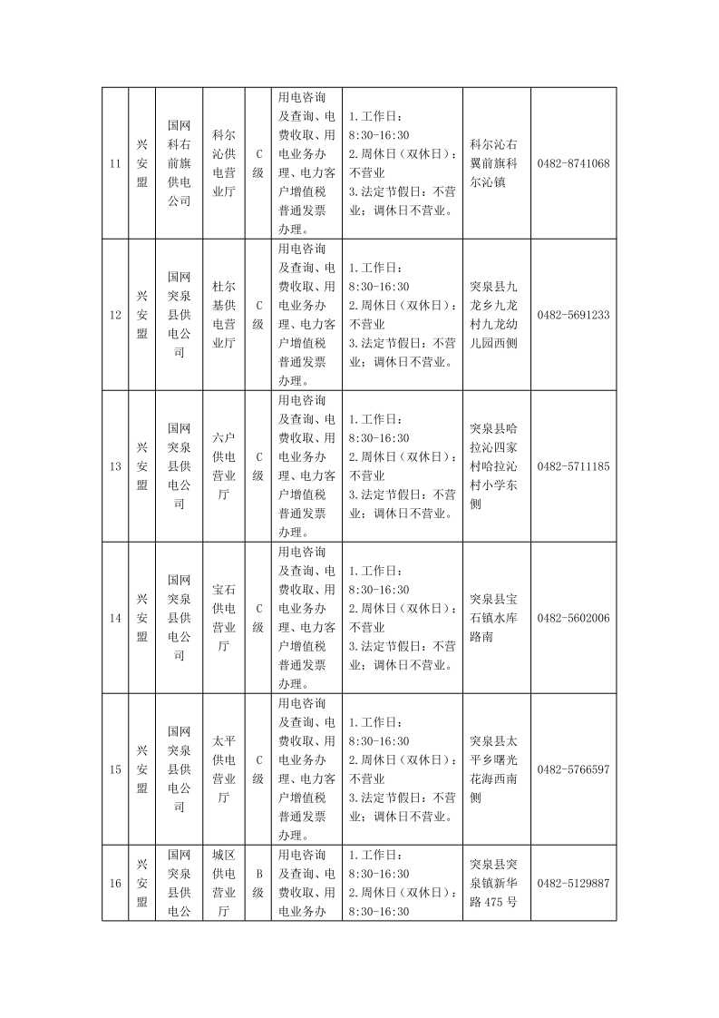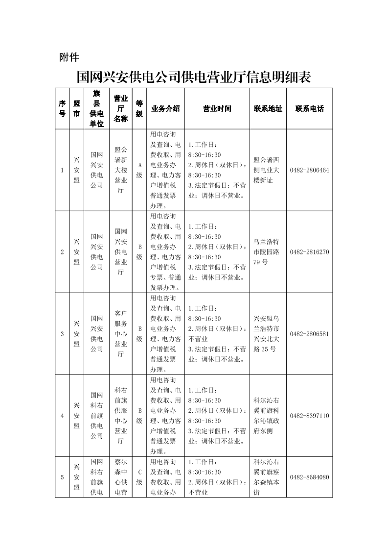 国网兴安供电公司供电营业厅信息明细表
