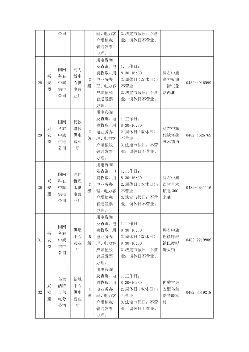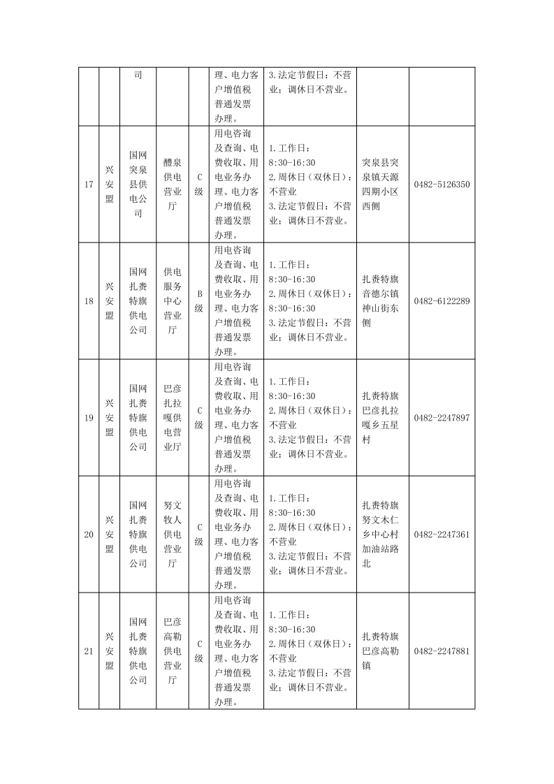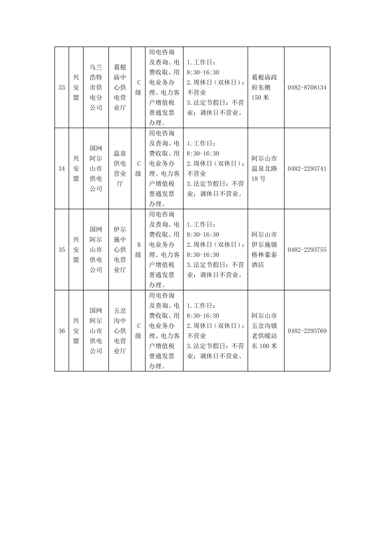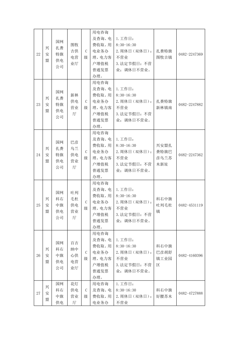 国网兴安供电公司供电营业厅信息明细表
