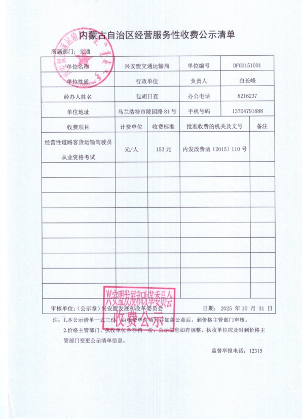 内蒙古自治区行政事业性收费公示清单(兴安盟交通运输局)