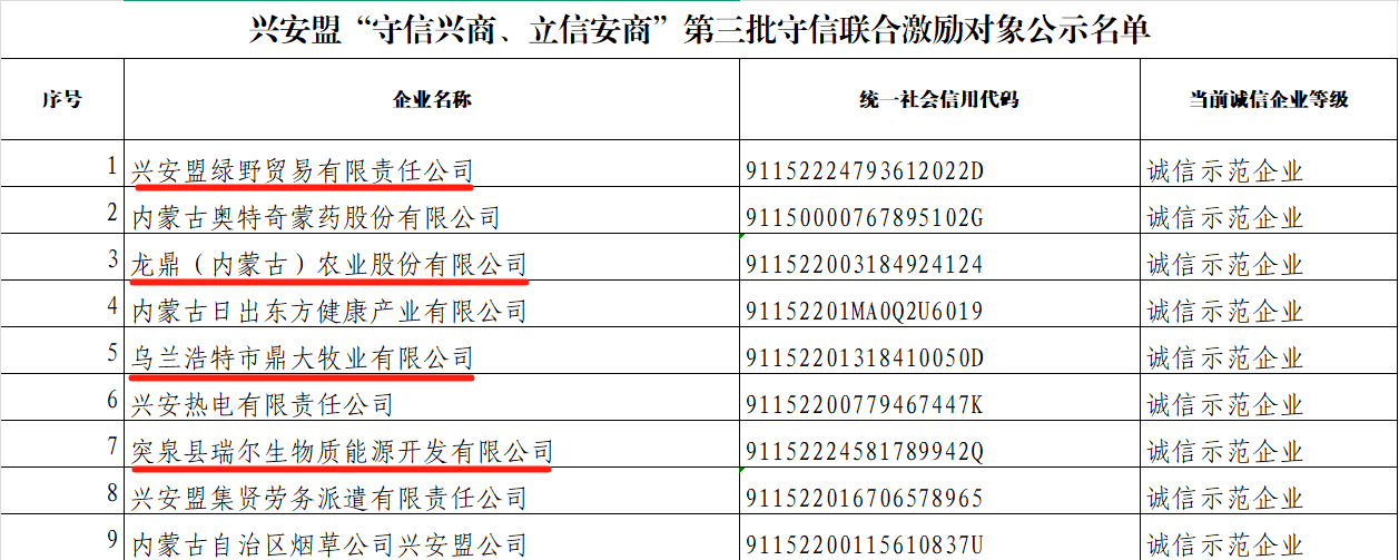 7月28日,兴安盟发改委公示了全盟第三批9家“立信兴商守信安商”守信联合激励主体名单,4家农牧业企业入选(后附名单),名单现已通过“信用中国(兴安盟)”网站公示。