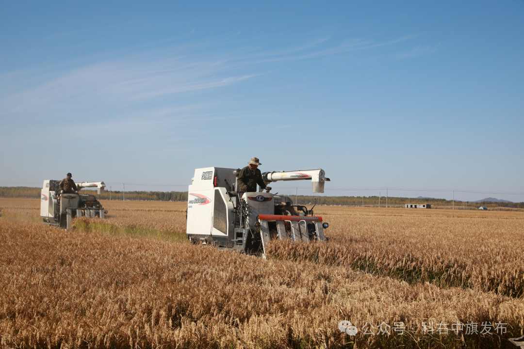 与此同时,在杜尔基镇双金嘎查这片远近闻名、有着悠久种植历史的水稻基地,丰收的景象更承载着历史的变迁。昔日,这里的人们面朝水田背朝天,依靠镰刀和汗水“粒粒皆辛苦”;如今,高效的收割机正沿着预设路线稳步推进,在金色的稻浪中划出整齐的轨迹。蓝天、白云、“铁牛”机械与农户忙碌的身影,构成了一幅动人的现代农耕图景。