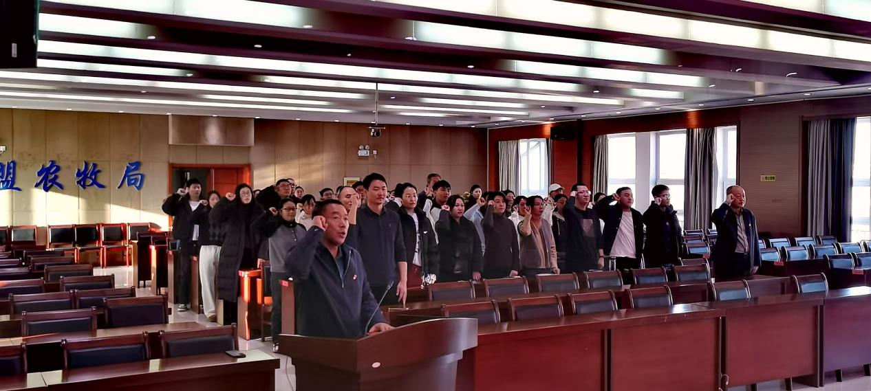 誓言铿锵映初心,新进人员共宣誓。12月2日,兴安盟农牧局组织2025年新入职、新任职的干部职工举行了庄严的宪法宣誓仪式。局四级调研员邵英旭领誓,全体人员面向国旗,右手举拳,庄严宣誓,表达了对宪法的忠诚与敬畏,坚定了恪尽职守、依法履职的决心。