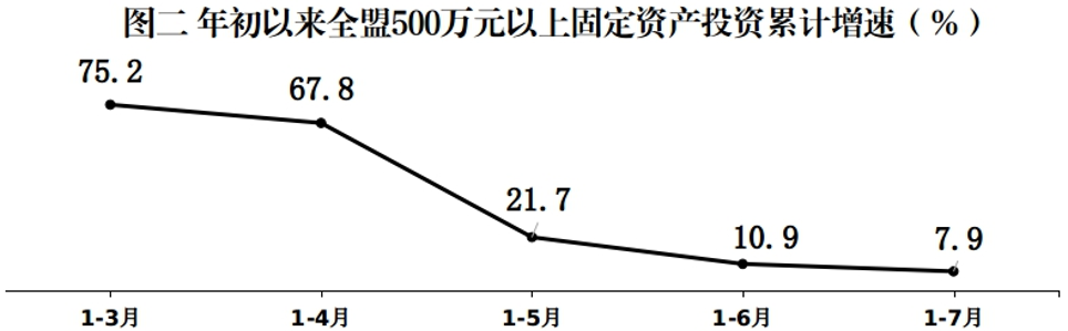 1-7月份,全盟500万元以上固定资产投资同比增长7.9%,增速居全区12个盟市第7位;两年平均增长11.9%,高于全区13.1个百分点。第三产业投资稳定增长。三产投资同比增长19.5%,增速分别高于一、二产投资45.5个、22.9个百分点,拉动全部固定资产投资增长11.1个百分点。主要领域投资增势较好。全盟房地产开发投资额25.40亿元,同比增长36.8%,拉动全部固定资产投资增长7.2个百分点;商品房销售额、销售面积同比分别增长102.6%、95.3%。基础设施投资同比增长9.2%,拉动全部固定资产投资增长5.1个百分点。工业技改投资同比增长18.1%,其中:电力热力燃气及水的生产和供应业技改投资同比增长54.2%,拉动全部工业技改投资增长13.4个百分点;制造业技改投资同比增长6.2%,拉动全部工业技改投资增长4.7个百分点。亿元以下项目投资较为活跃。全盟有投资活动的亿元以下项目完成固定资产投资同比增长39.1%,拉动全部固定资产投资增长3.5个百分点。
