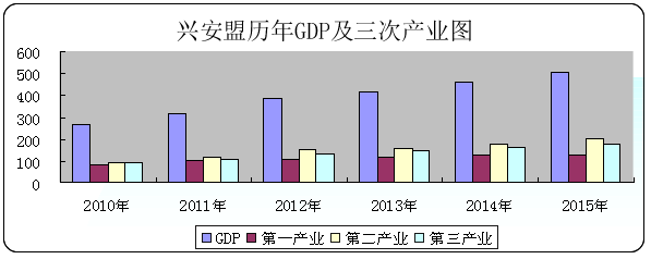 2015年兴安盟全年实现地区生产总值502.31亿元,其中:第一产业增加值125.15亿元,第二产业增加值198.98亿元,第三产业增加值178.19亿元。在地区生产总值中,一、二、三次产业比例为25:40:35。全盟人均地区生产总值31391元,增长9.1%。兴安盟历年社会经济主要指标详见表2-1-2和图。