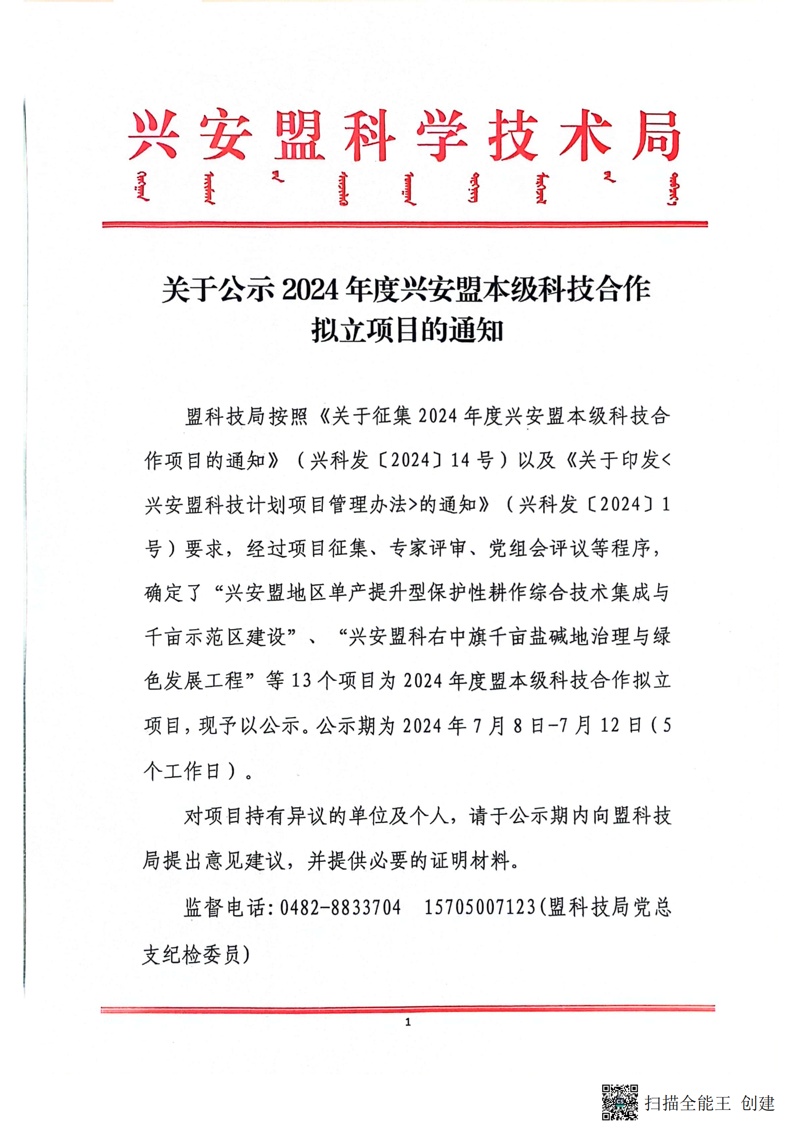 关于公示2024年度兴安盟本级科技合作拟立项目的通知