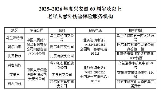 为积极应对人口老龄化带来的养老、医疗等方面社会风险,切实提高老年人及其家庭抗风险能力,按照《内蒙古自治区关于开展老年人意外伤害保险工作的指导意见》(内老龄办发﹝2017﹞1号)、《内蒙古自治区老年人意外伤害保险实施方案》(内老龄办发﹝2018﹞2号)等要求,兴安盟民政局通过招标的方式确定与中国人民财产保险股份有限公司内蒙古自治区分公司、中国人寿保险股份有限公司兴安分公司合作,为具有兴安盟户籍,年满60周岁(含)以上老年人投保意外伤害保险(老年人无需出资,直接享受此权益),公告如下: