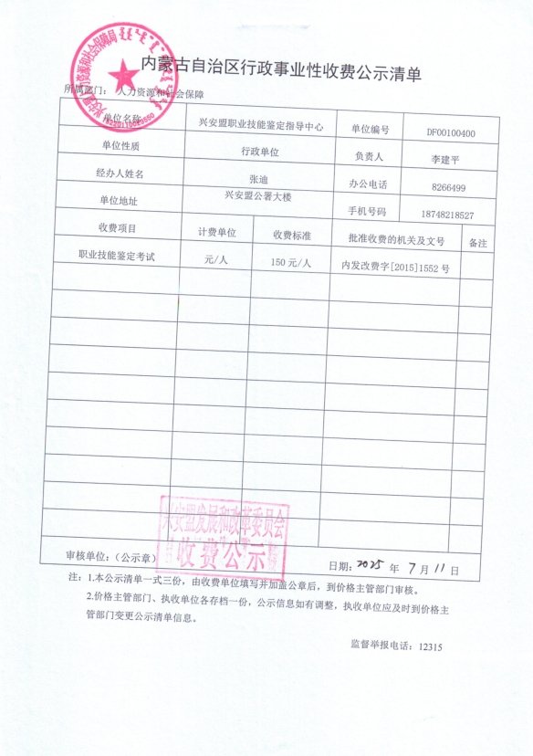内蒙古自治区行政事业性收费公示清单(兴安盟职业技能鉴定指导中心)