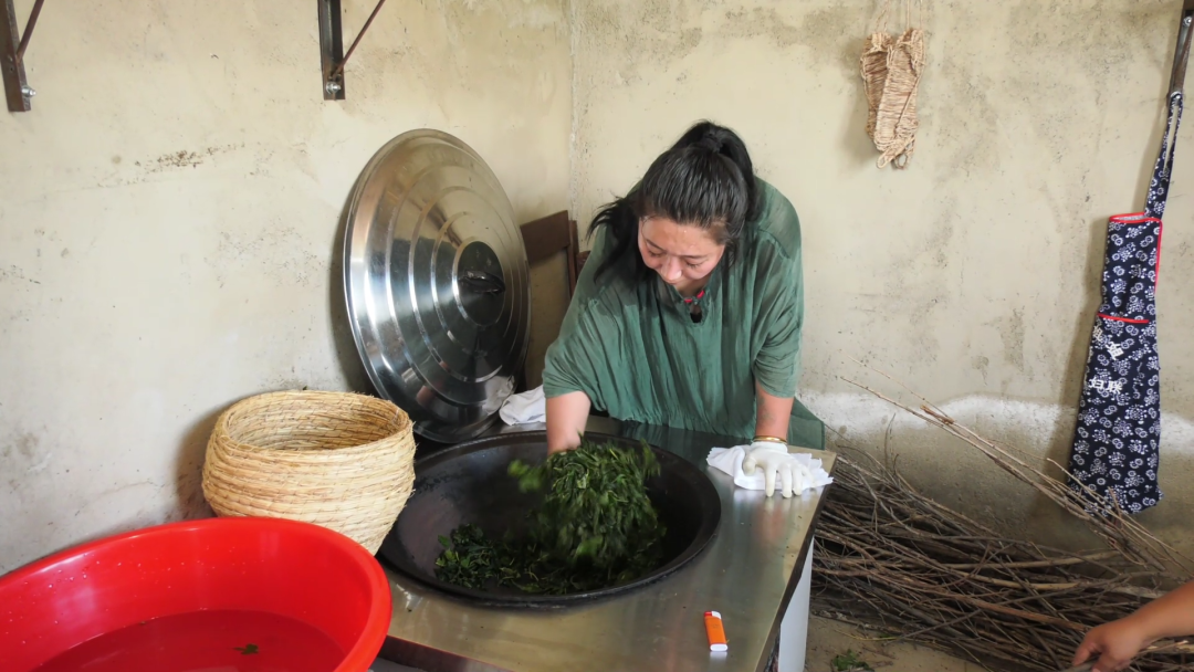 走进加工坊,桑叶茶正在如火如荼地制作中。从采摘枝头嫩叶,到草篾帘中摊晾蒸发水汽,再经柴火大锅杀青锁住鲜度,历经两次揉捻塑形、两次炒制提香,共7道工序耗时5小时。“杀青火候不到会带青涩味,揉捻力度不够则香味不足。”为了做出满意的成品,刘丽娟特意赴外地学习数月,将传统制茶技艺与现代养生理念结合,最大限度保留原料天然性味,已开发出桑叶茶、黄芩茶、蒲公英茶、车前草茶、枸杞茶 等5 种产品。“看这桑叶茶,泡出来叶片舒展,色泽清亮,味道清甜。”她端起泡好的茶介绍道。