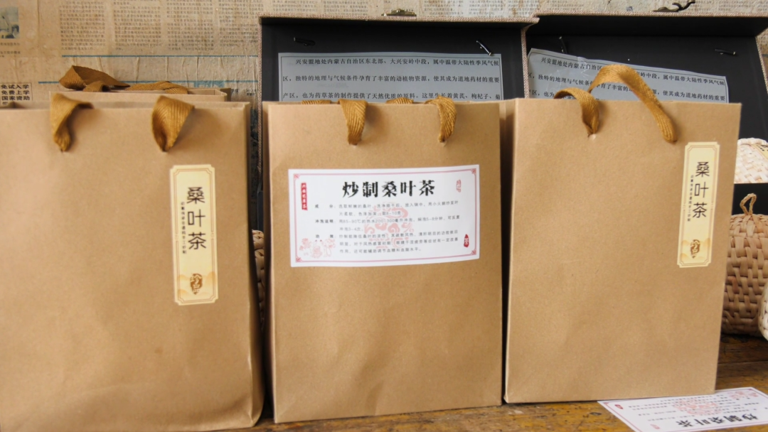 7月的科右前旗俄体镇兴安村,草木葱郁,阳光正好。在科右前旗劲草传承手工艺品专业合作社,社员们穿梭在房前屋后的林地间,采摘着鲜嫩的桑叶。“我们这里漫山遍野都是宝贝。”刘丽娟捧着刚炒制好的桑叶茶介绍,“桑树叶、蒲公英、车前草都是《本草纲目》里记载的药食同源食材,既能入药又能养生。”